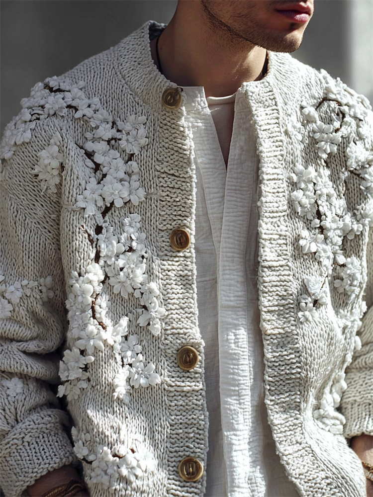 Men's Japanese White Almond Blossom Cozy Knit Cardigan
