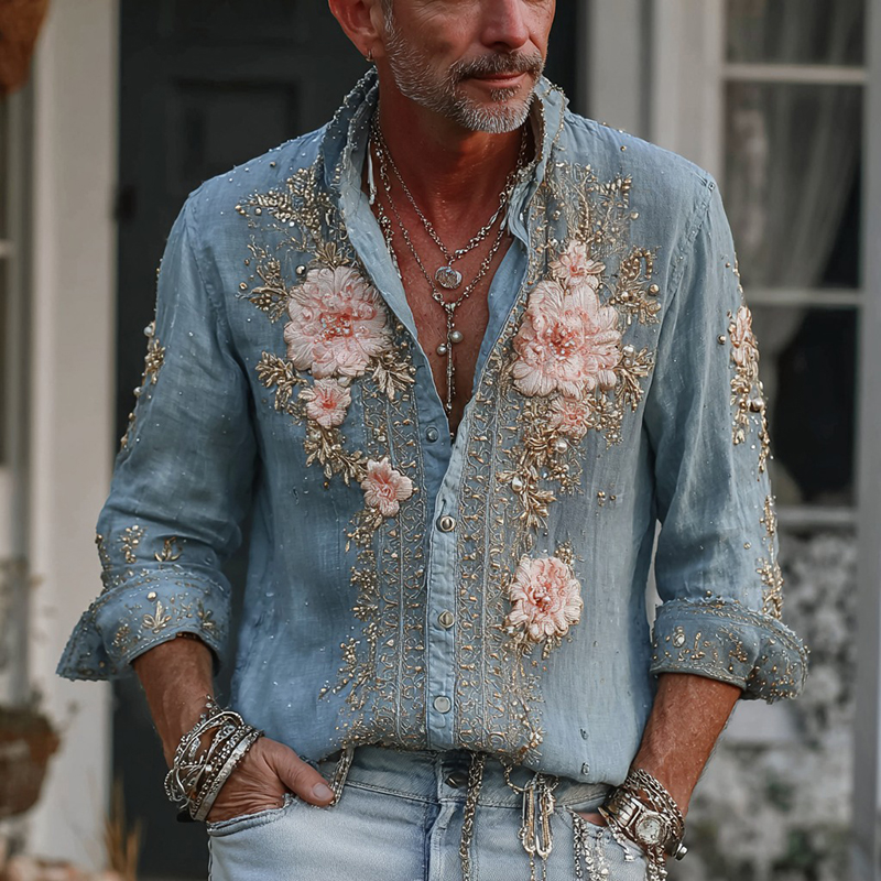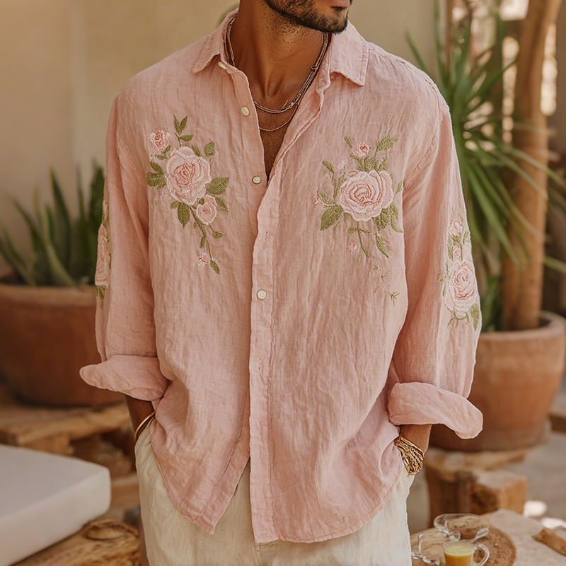 Men's Vintage Rose Floral Embroidered Comfort Linen Shirt