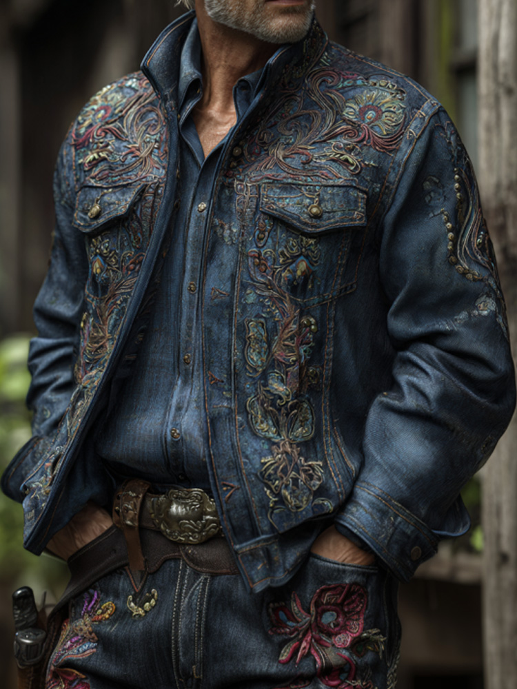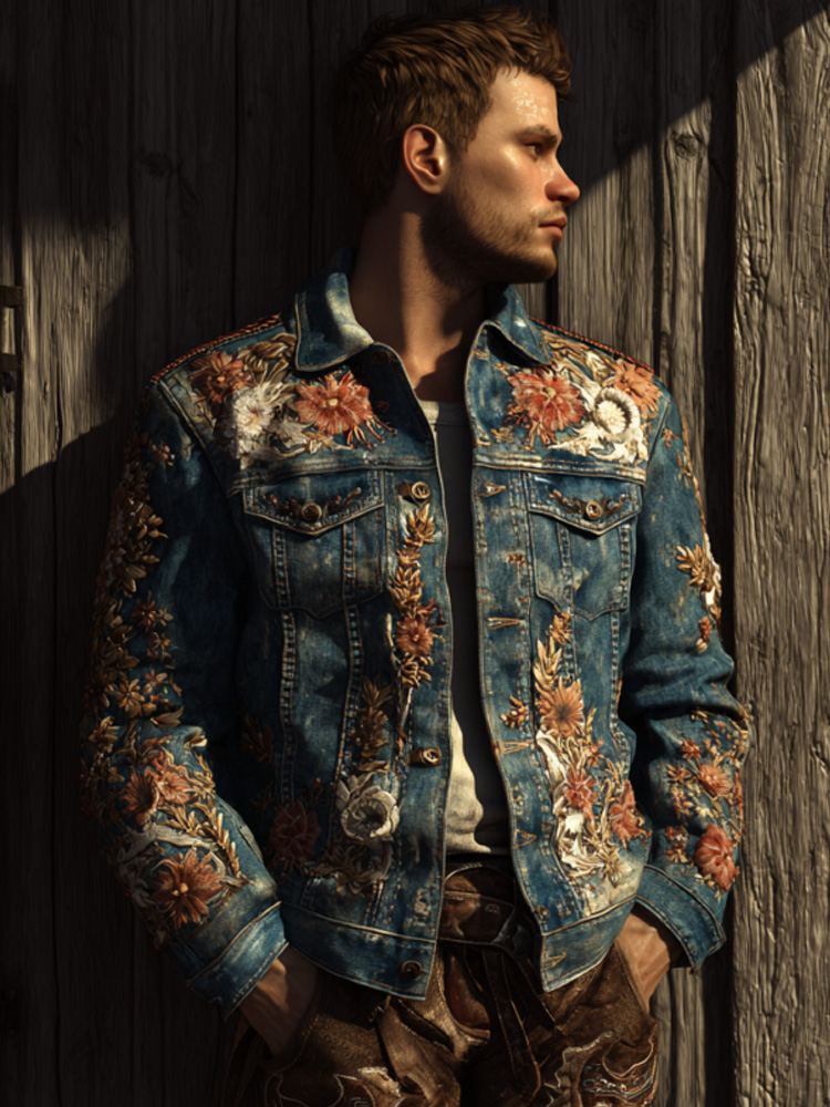 Men's Retro Vintage Floral Patchwork Art Denim Jacket