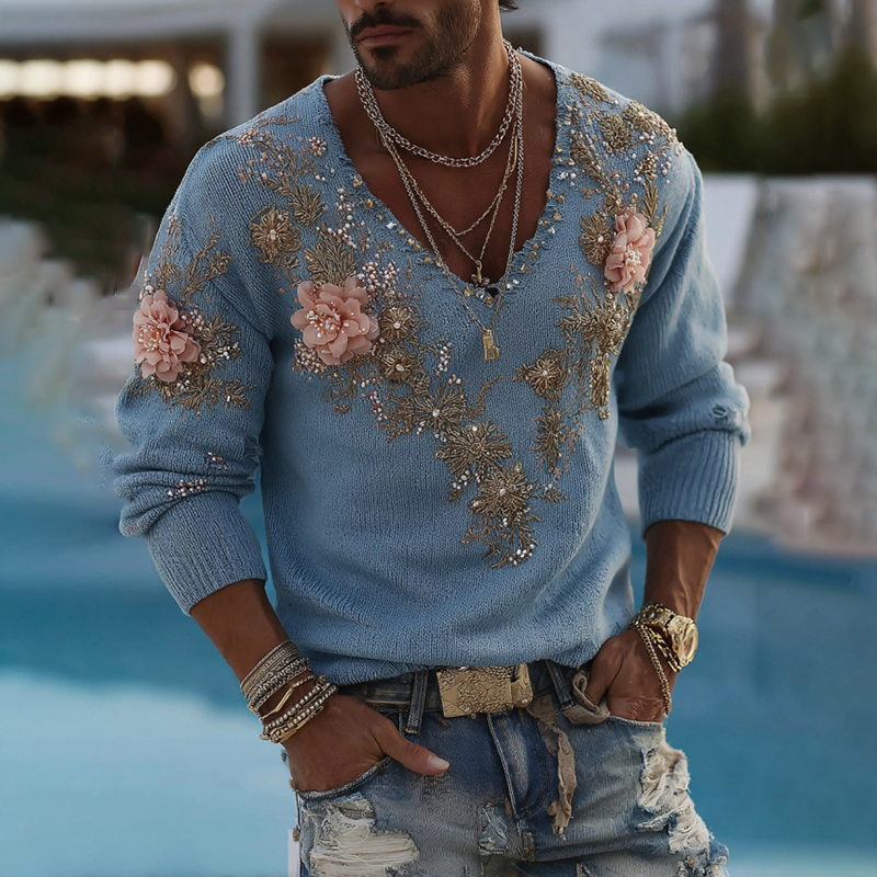 Men's Vintage Rose Floral Embroidered V Neck Cozy Sweater