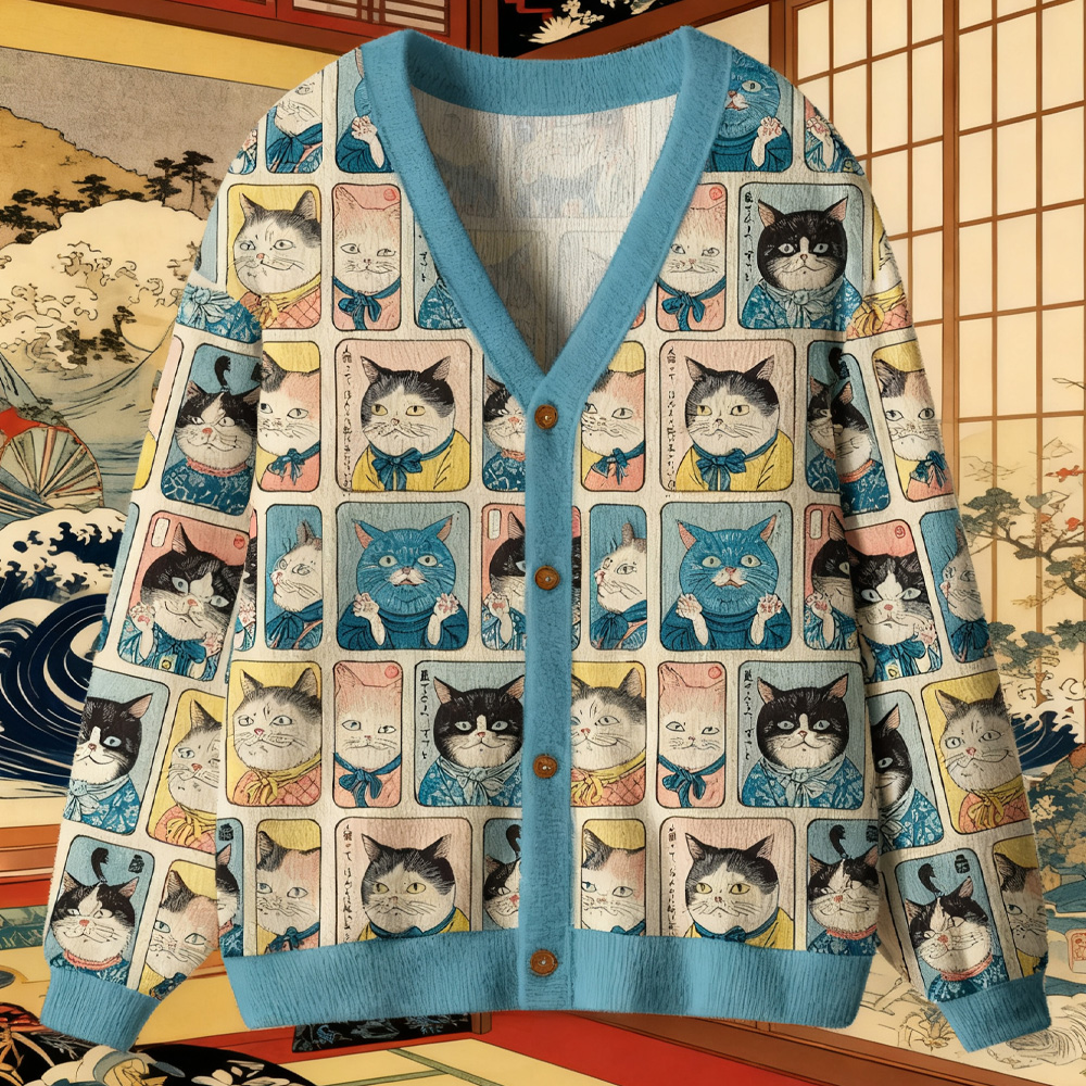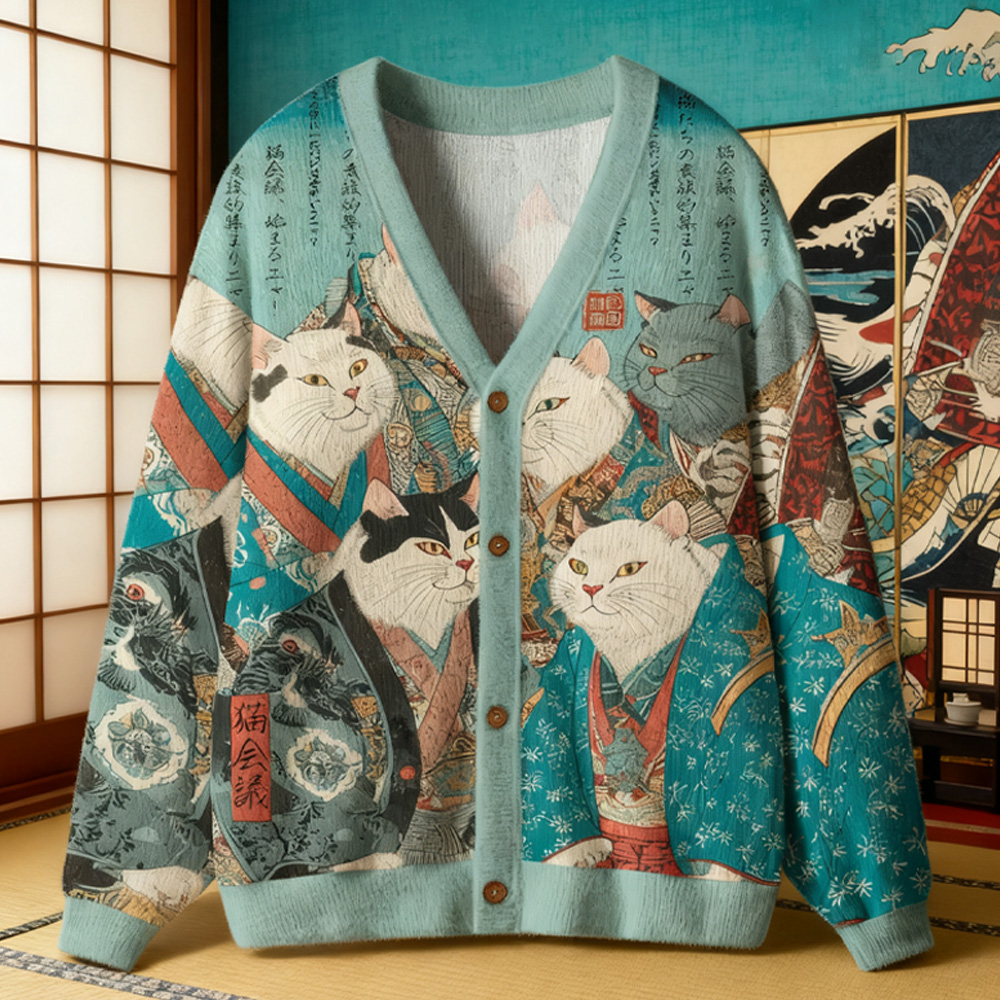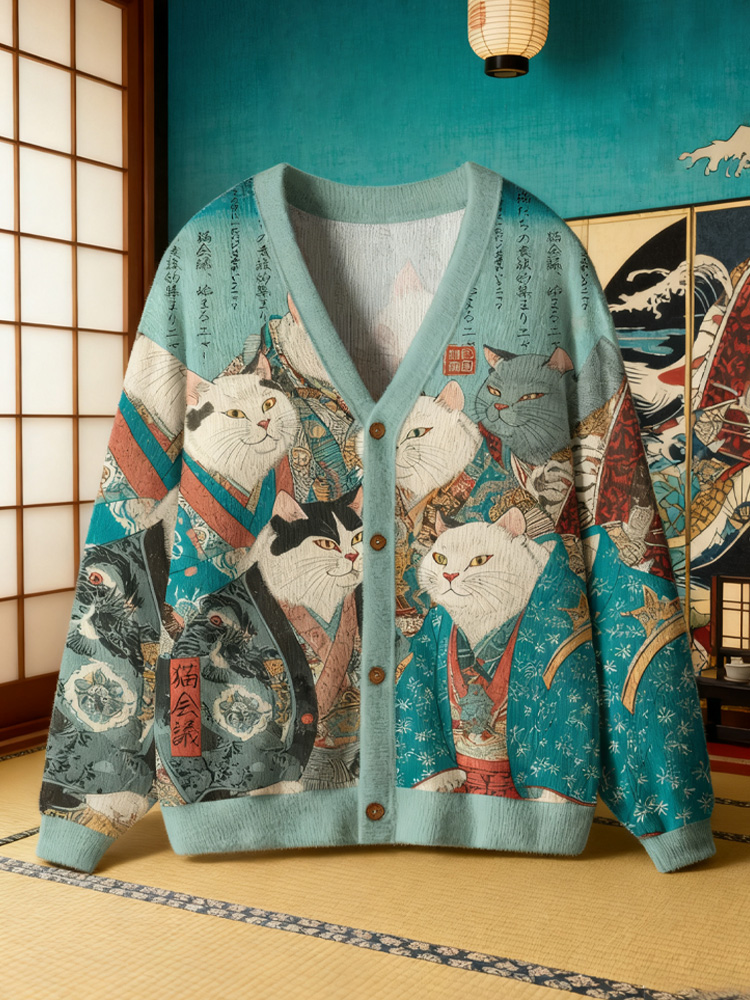 Men's Handsome Japanese Cat Warrior Calligraphy Art Print Pocket Hooded Sweatshirt