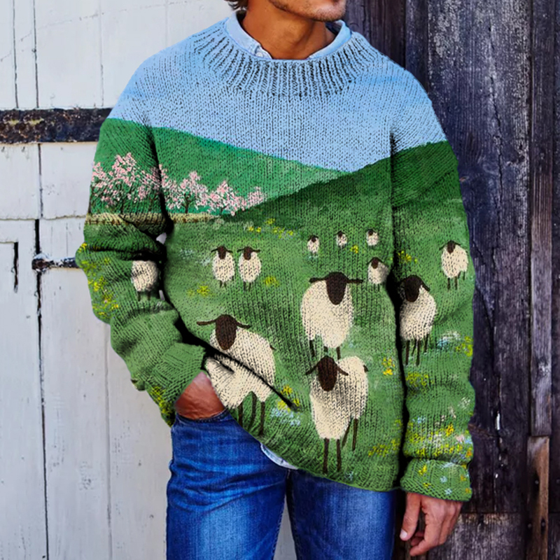 Men's Vintage Sheep Landscape Art Cozy Knit Sweater