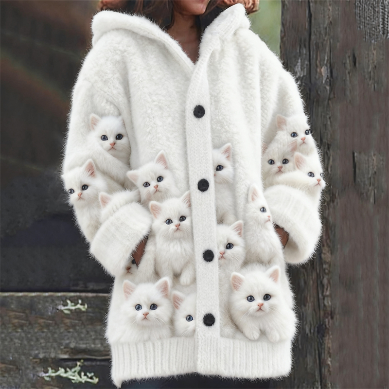 Crowded Fuzzy Cats Art Cozy Knit Hooded Cardigan