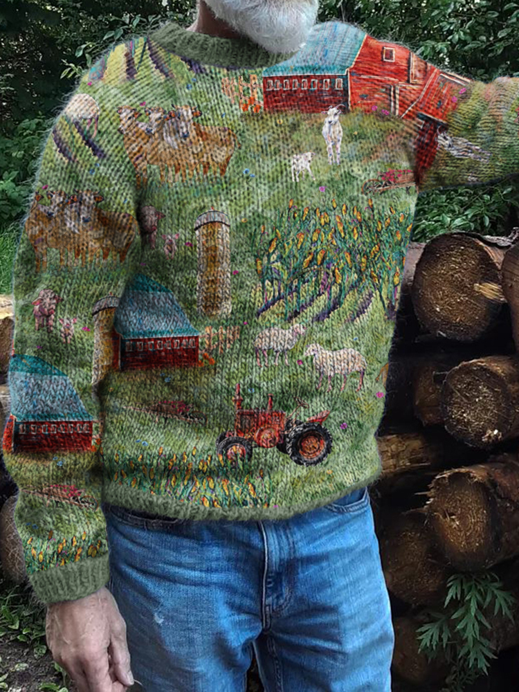 Mens Vintage Fair Isle Sheep Knitted Art Cozy Knit Sweater