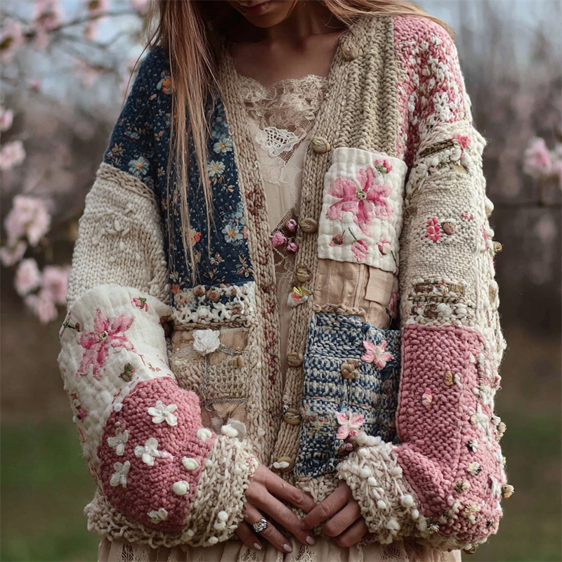 Cherry Blossom Embroidered Japanese Sashiko Patchwork Cozy Knit Cardigan
