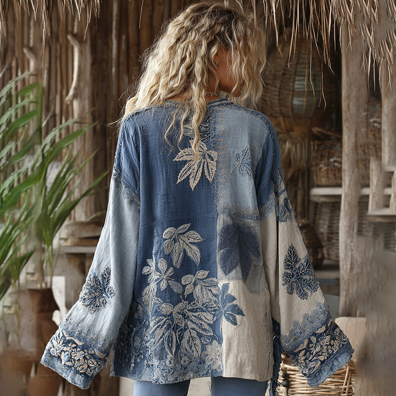 Retro Bohemian Floral With Japanese Traditional Sashiko Art Embroidery Print Cotton And Linen Blend Kimono Cardigan