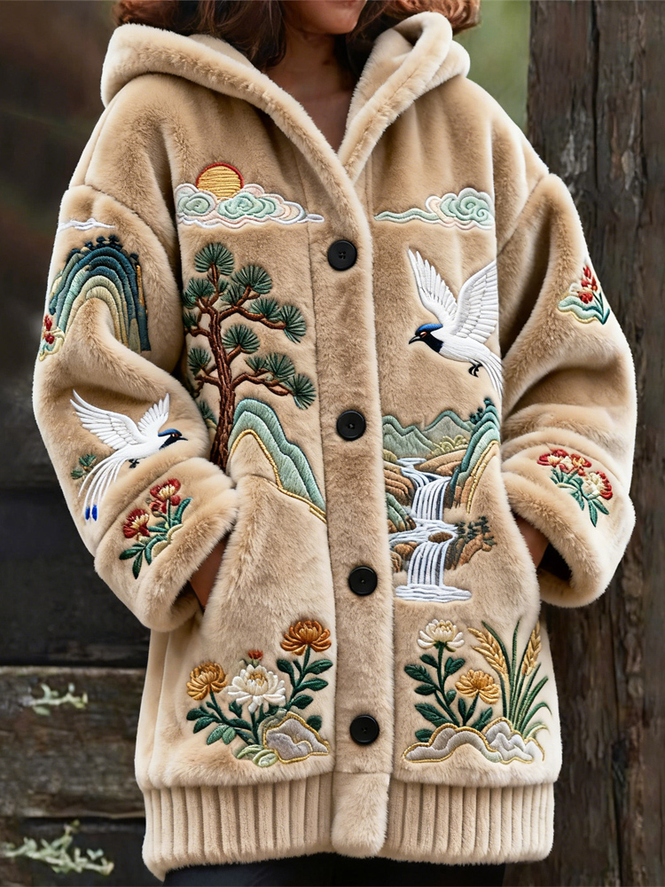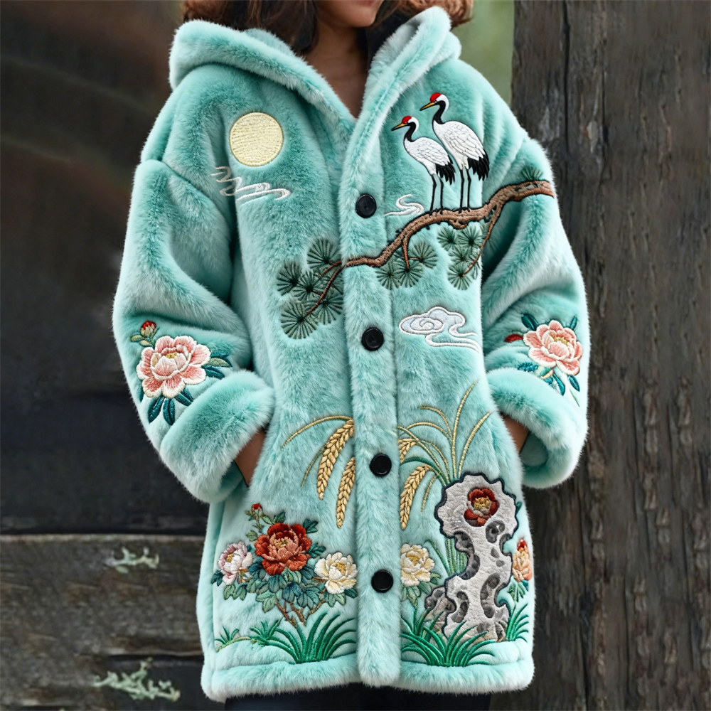 Japanese Floral & Crane Embroidery Design Women's Hooded Flannel Cardigan