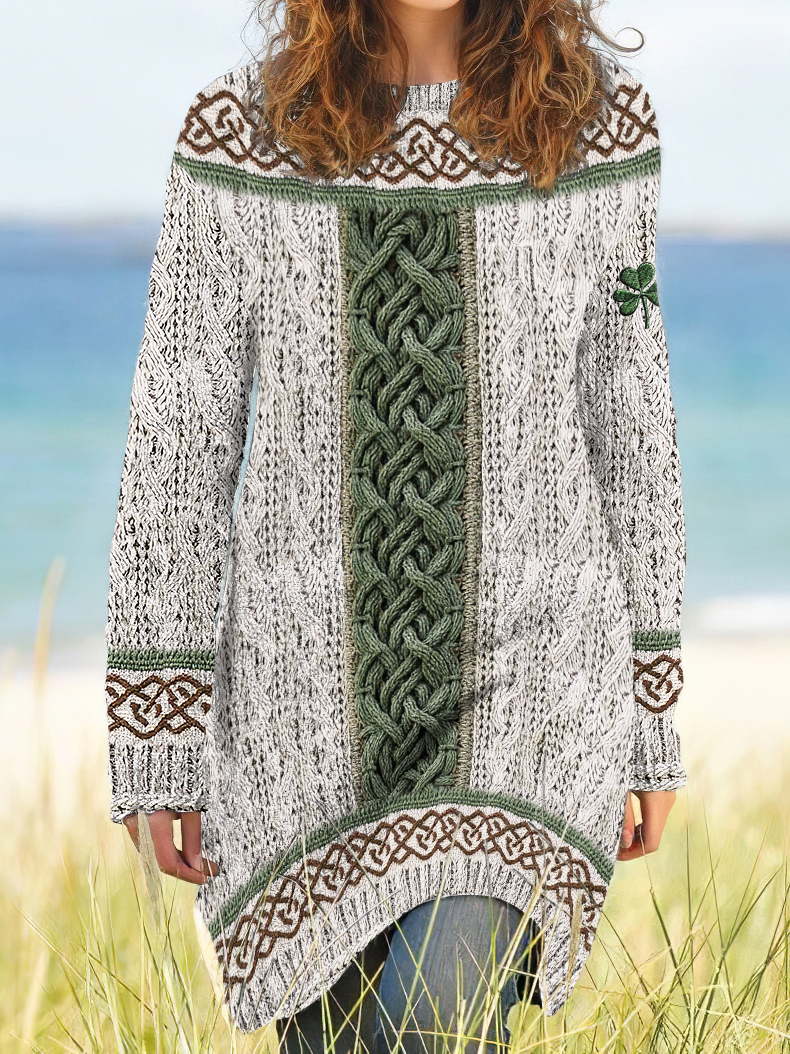 Women's Irish Celtic Knotted Shamrock Contrast Jacquard Sweater Dress