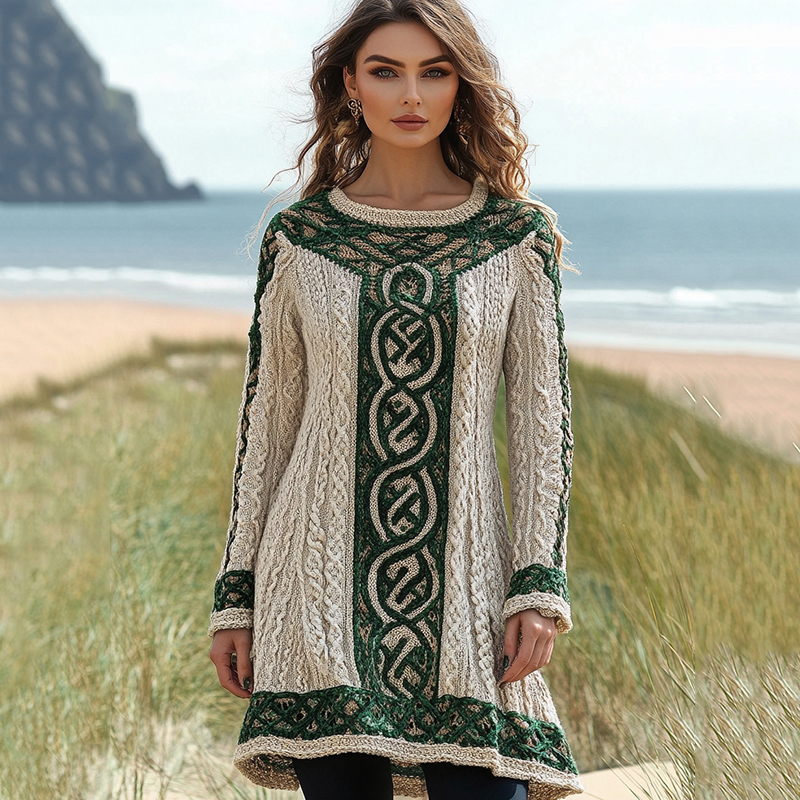 Women's Irish Celtic Knotted Crew Neck Contrast Sweater Dress