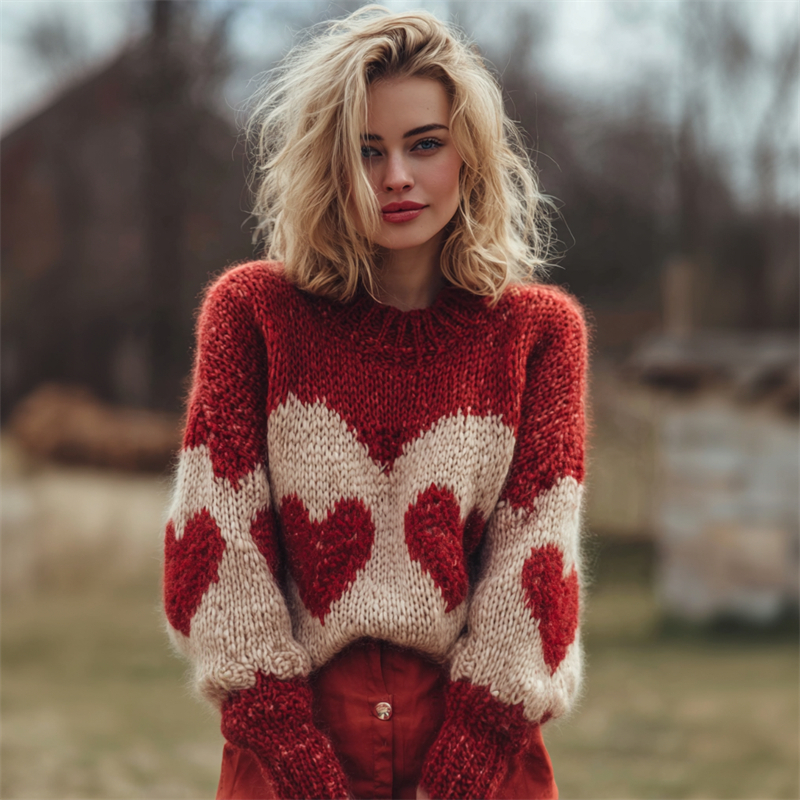 Retro Valentine's Day Heart Pattern Cozy Knit Sweater