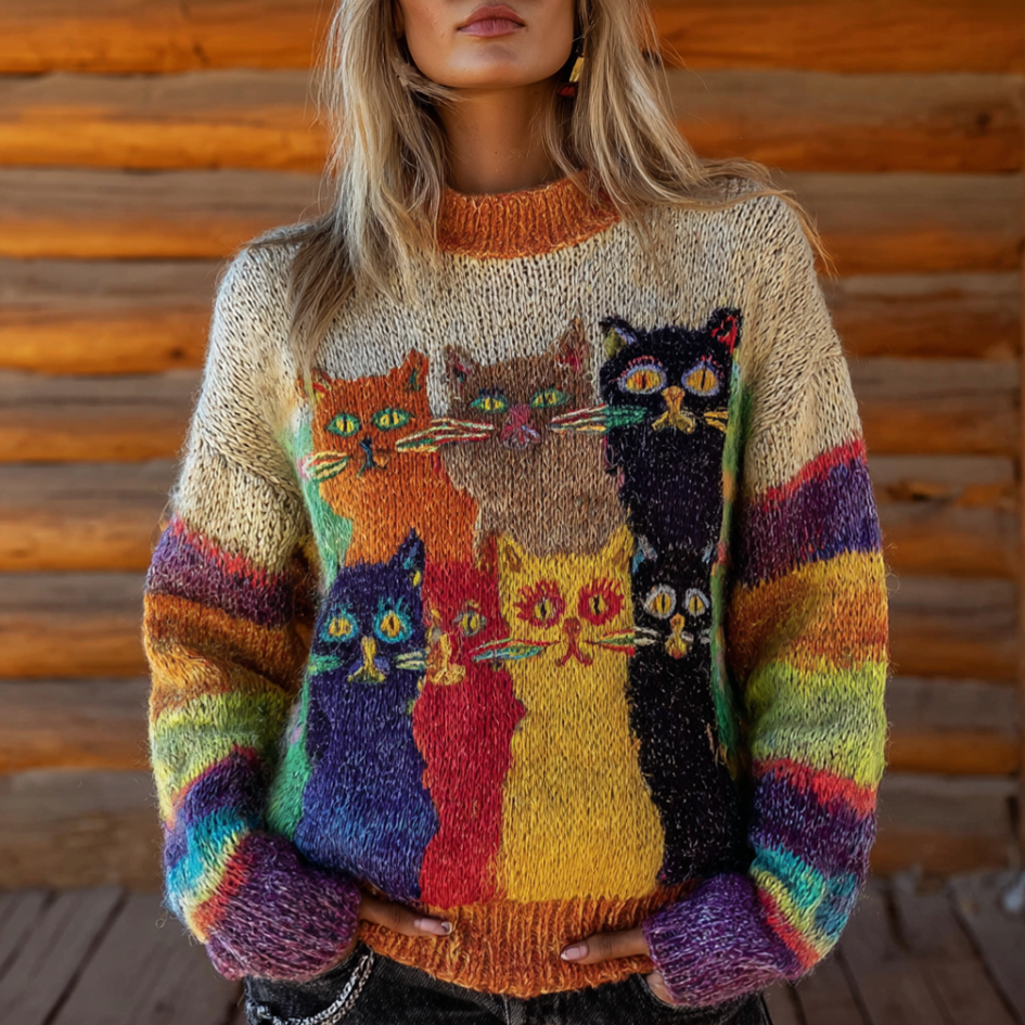 Retro Fun Cat Lady Round Neck Knitted Sweater