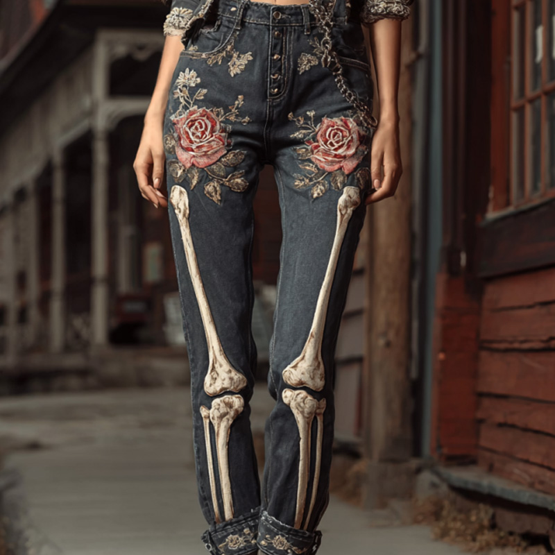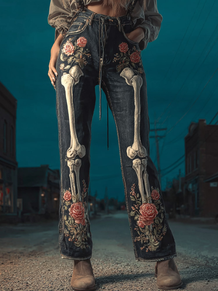 Halloween Vintage Skull Rose Embroidered Jeans