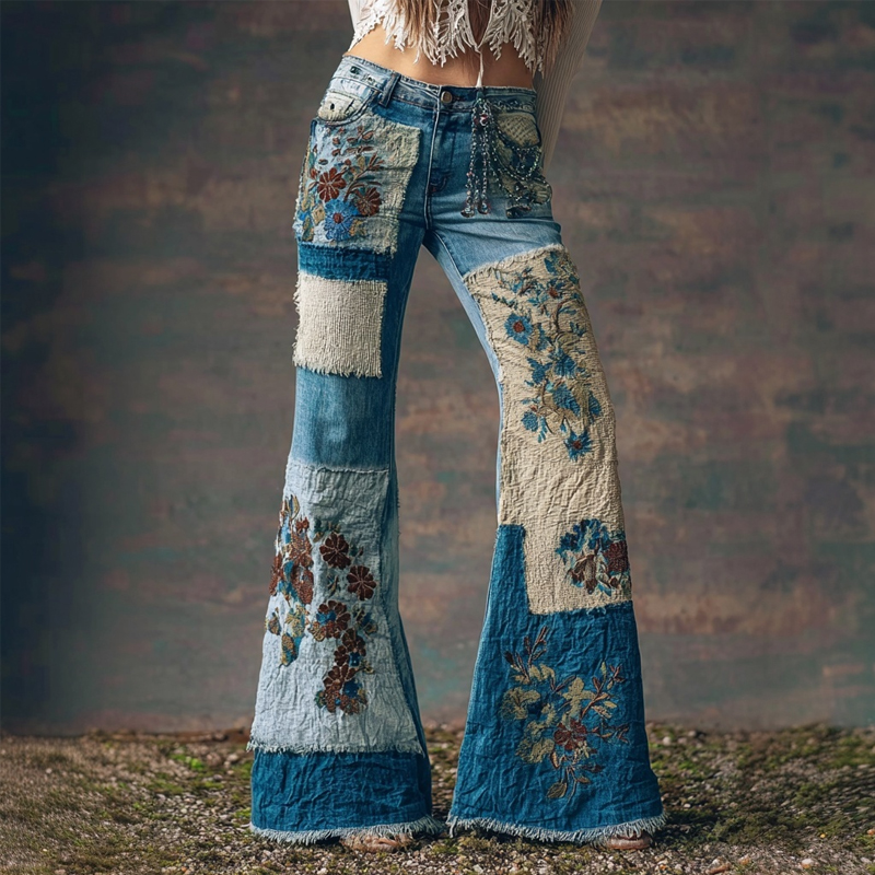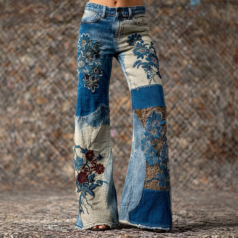 Boho Floral Lace Embroidered Patchwork Bootcut Jeans