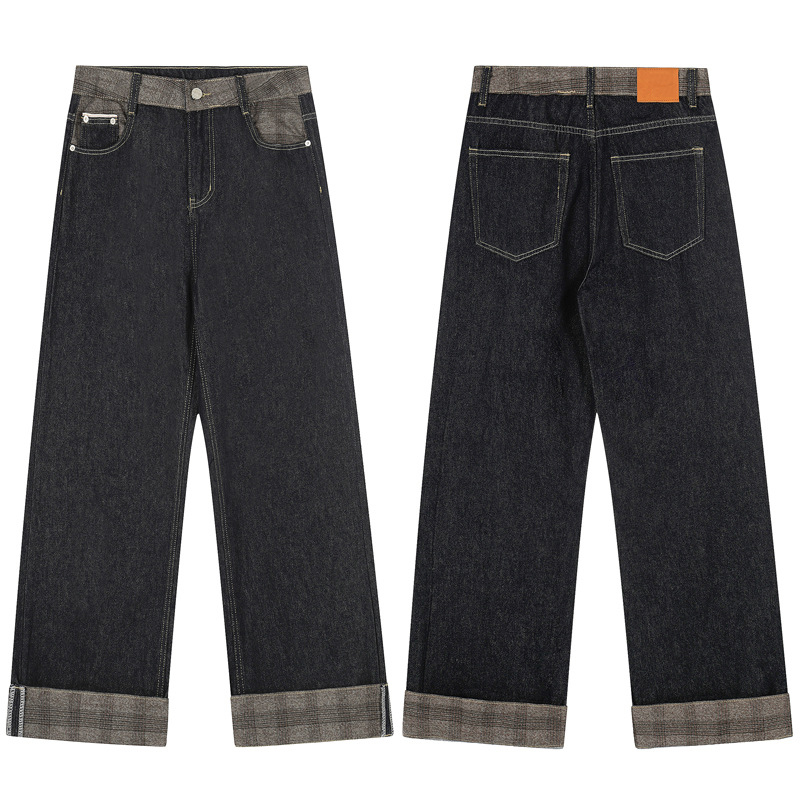 Street Color Plaid Patchwork Raw Denim Loose Jeans