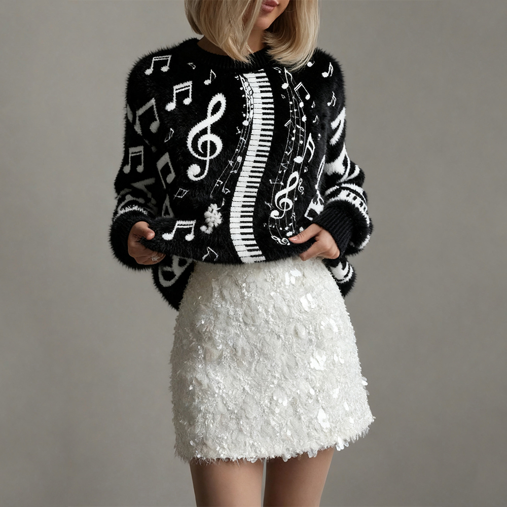 Piano Keys Music Notes Contrast Cozy Plush Sweater