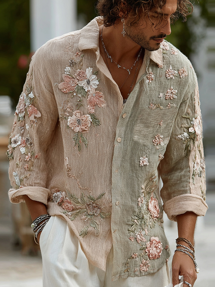 Men's Vintage Color Block Floral Embroidered Comfy Linen Shirt
