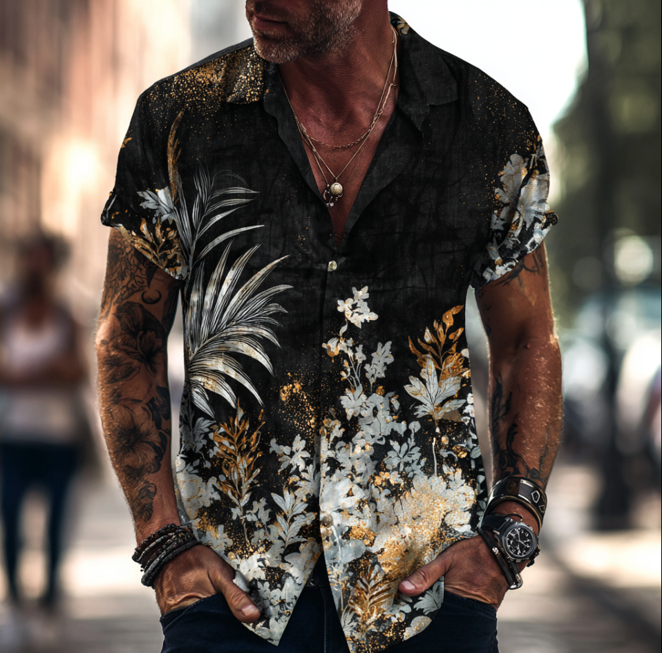 Bohemian Style Plant And Flower Pattern Men's Retro Cotton And Linen Short-sleeve Shirt