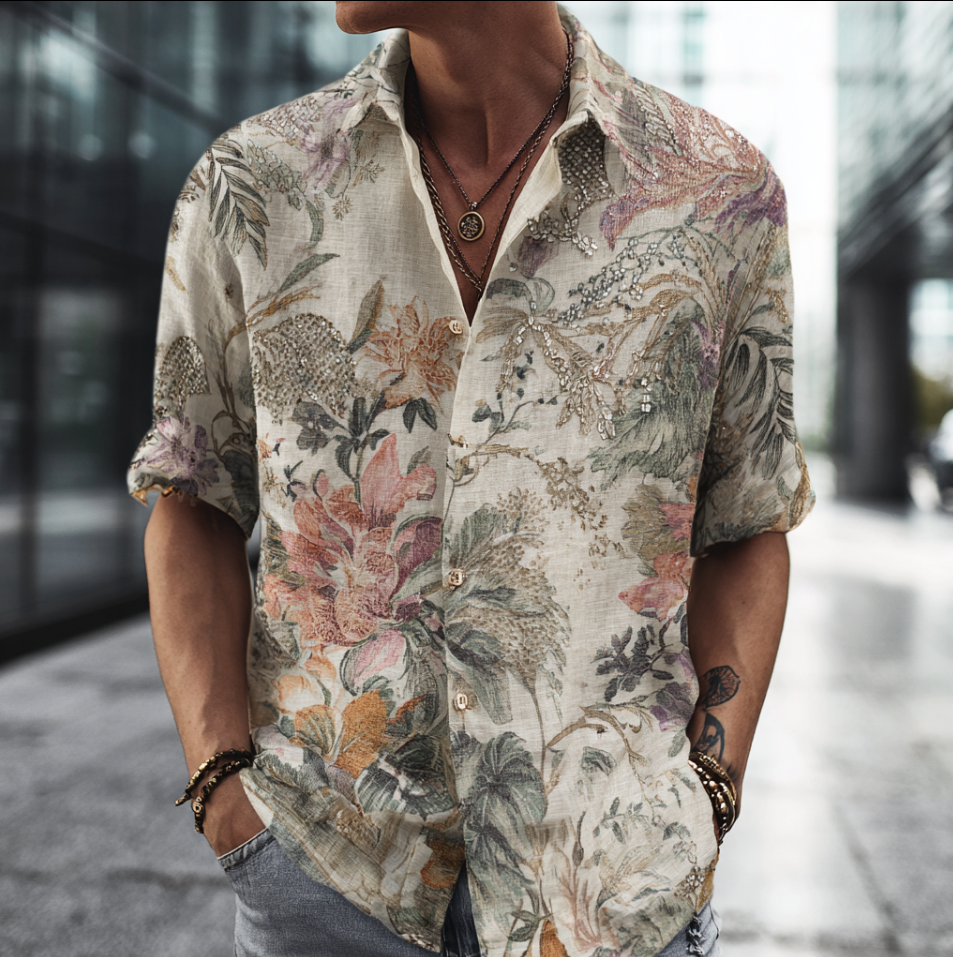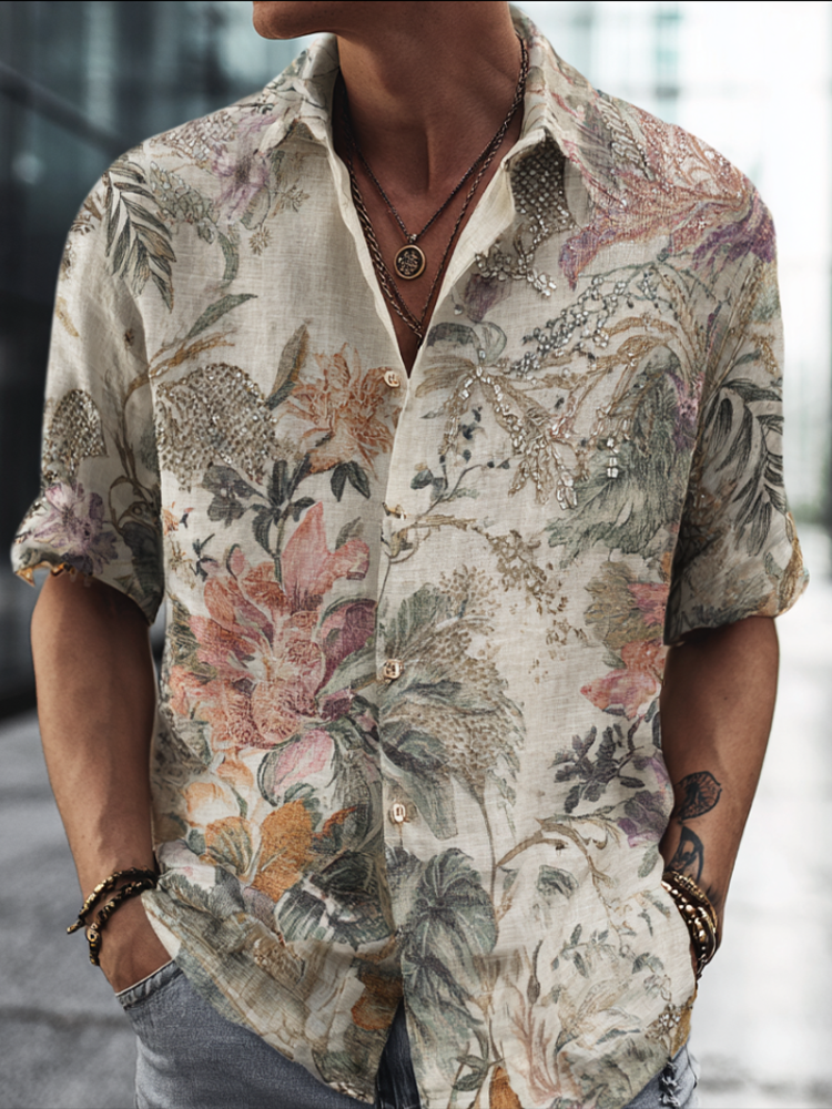 Bohemian Style Plant And Flower Pattern Men's Retro Cotton And Linen Short-sleeve Shirt