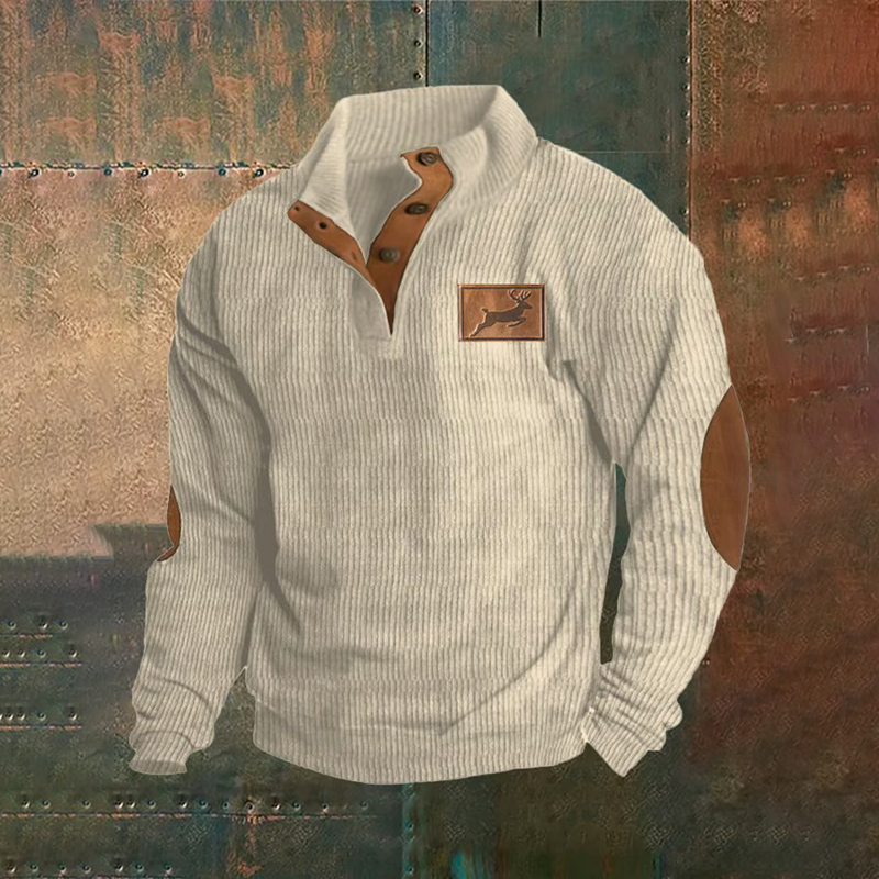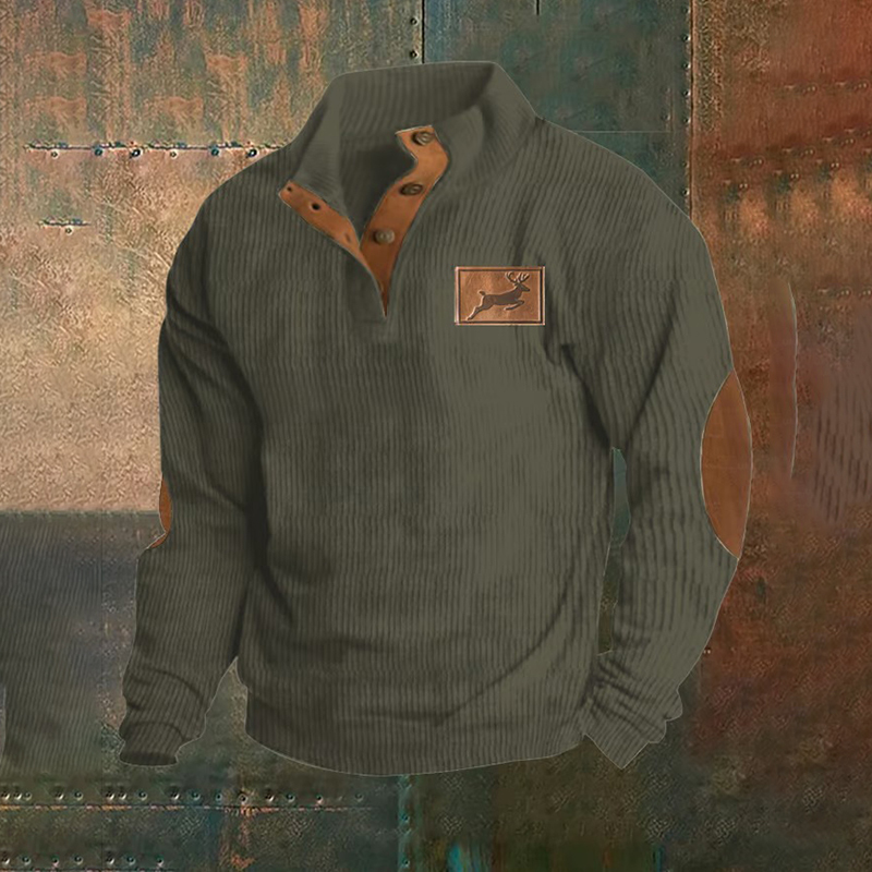 Corduroy Western Style Elk Print Stand Collar Button Down Men's Sweatshirt