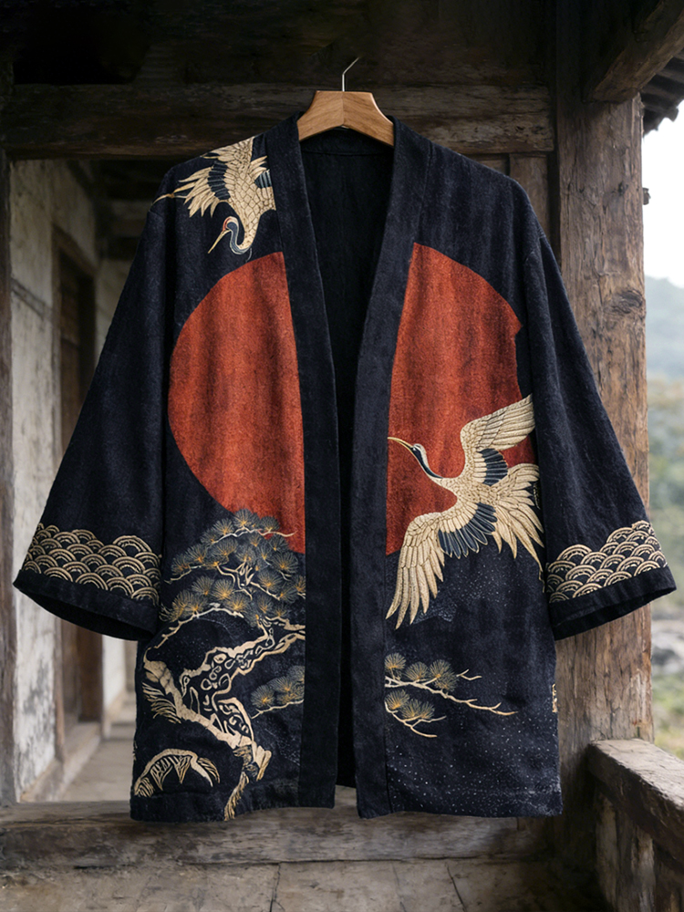 Japanese Pine Trees Crane Art Linen Blend Kimono Cardigan