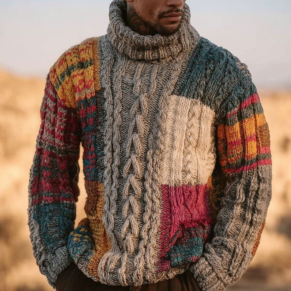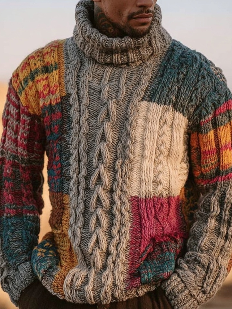 Men's Retro Geometric Patchwork Cozy Turtleneck Sweater