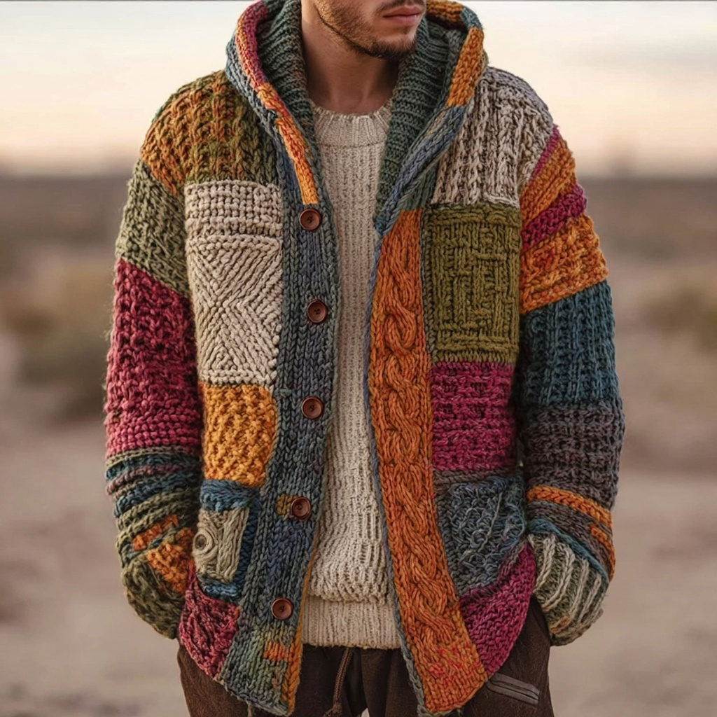 Men's Vintage Geometric Patchwork Cozy Hooded Cardigan