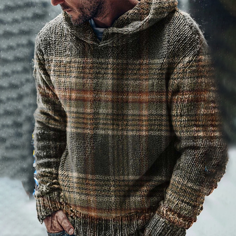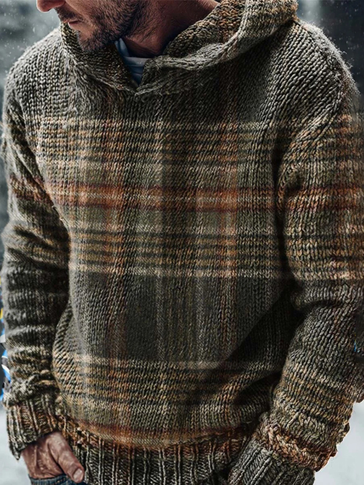 Vintage Plaid Art Print Casual Knitted Hoodie Sweater