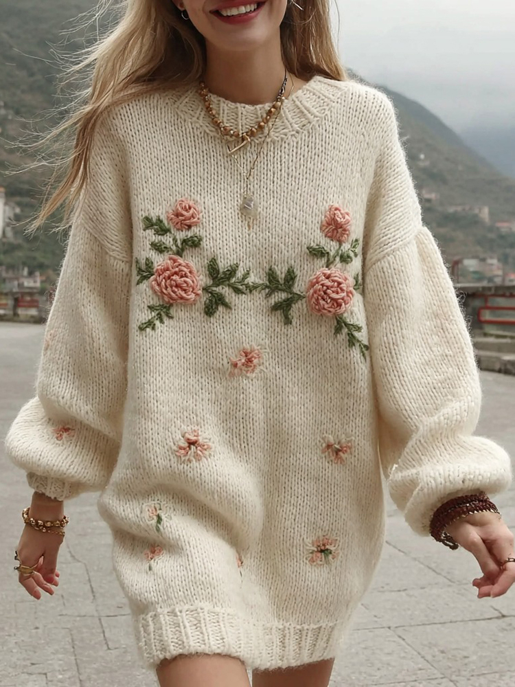 Women's Pink Rose Embroidery Knitted Round Neck Sweater Dress
