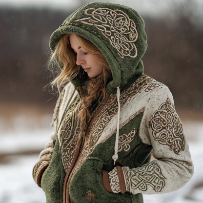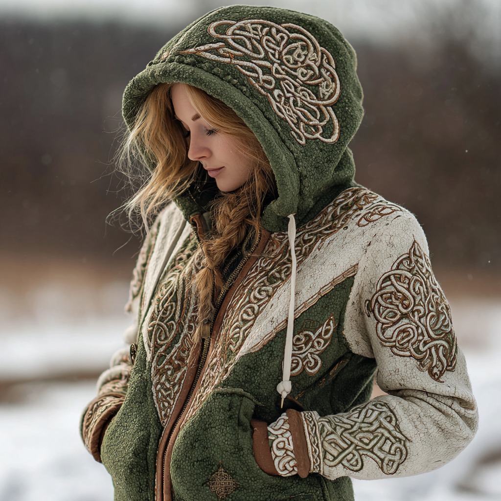 Women's Retro Celtic Irish Patchwork Plush Zip-up Hoodie