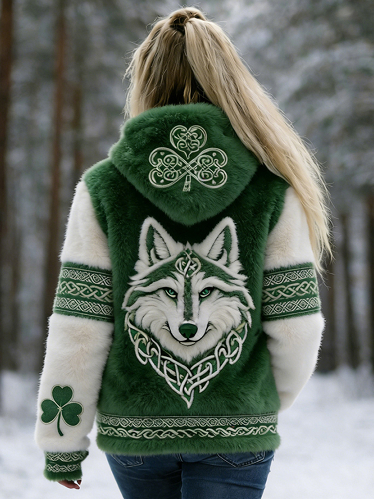Women's St. Patrick's Day Clover With Wolf Print Zipper Flannel Hoodie