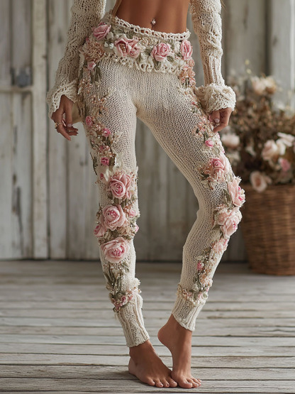 Women's Vintage Pink Floral Art Cozy Knit Leggings