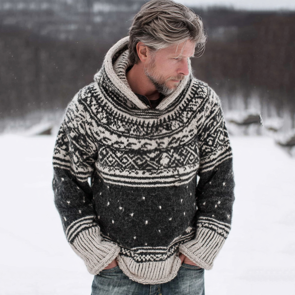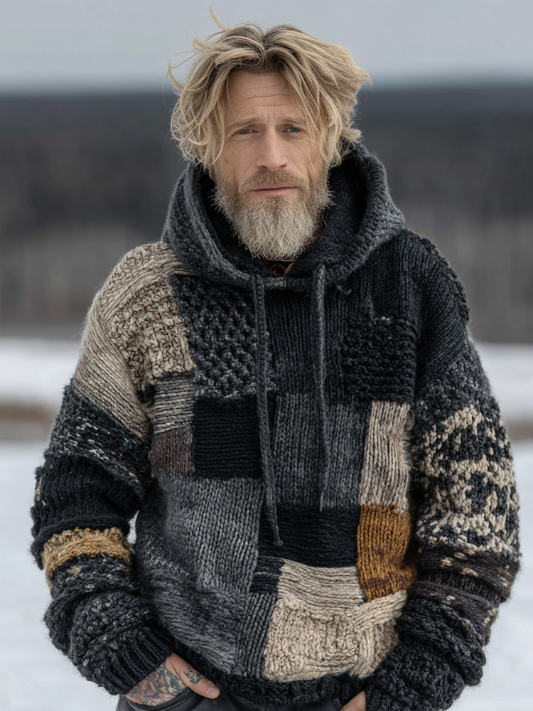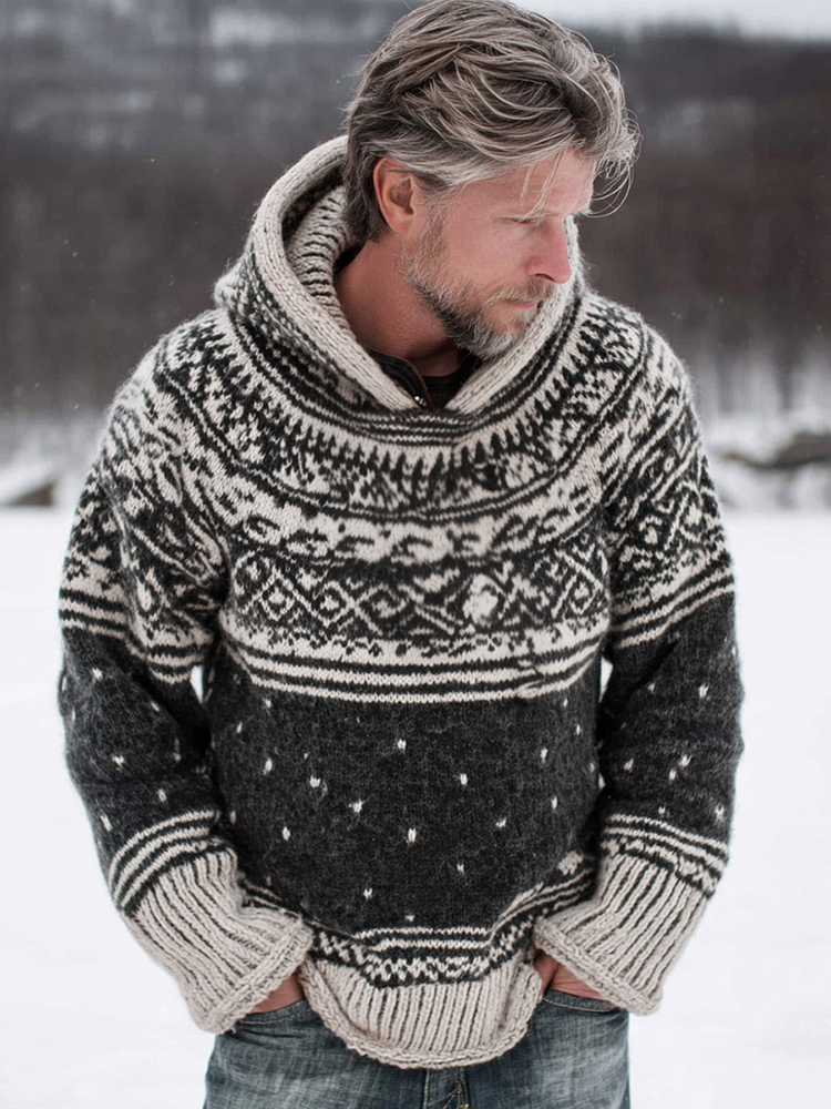 Men's Vintage Warmth Scandinavian Knit Jacquard Icelandic Thick Warm Hooded Sweater