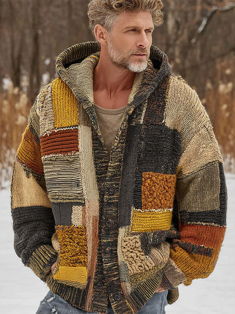 Men's Vintage Geometric Block Art Jacquard Thick Warm Hooded Sweater Cardigan