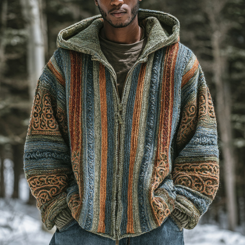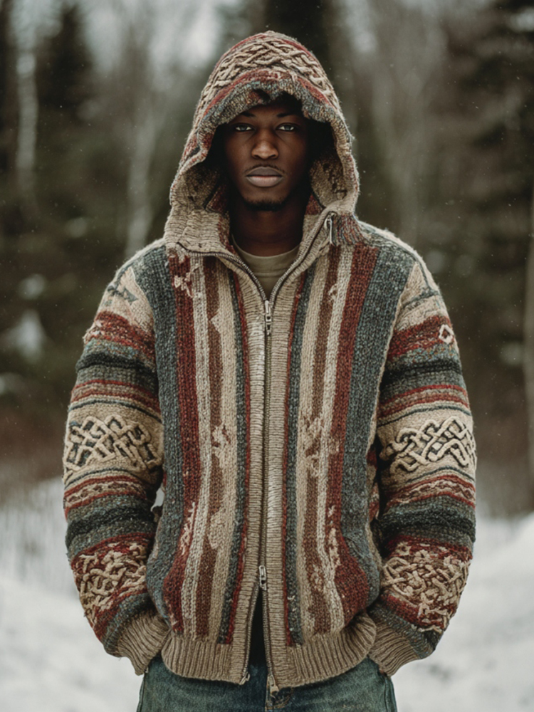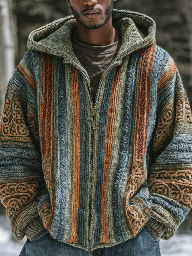 Men's Vintage Colorful Striped Celtic Art Jacquard Thick Warm Zip Hooded Sweater Cardigan