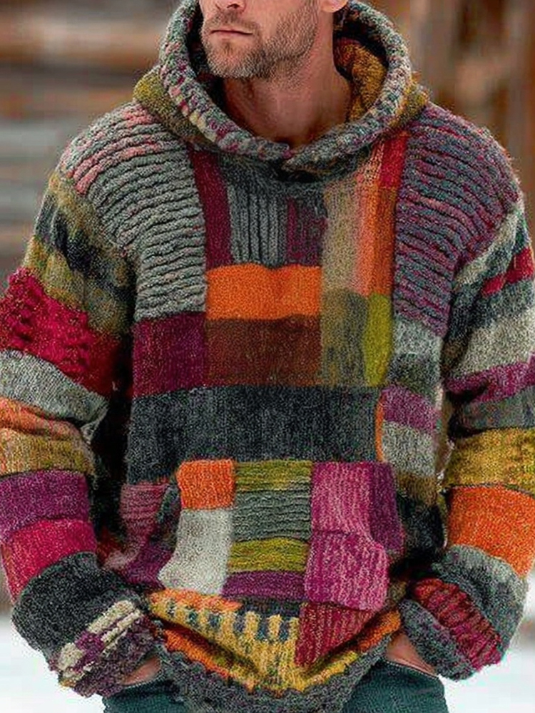 Men's Vintage Sunset Style Colorblock Patchwork Cozy Knit Jacquard Fairman Island Jacquard Thick Warm Hooded Sweater