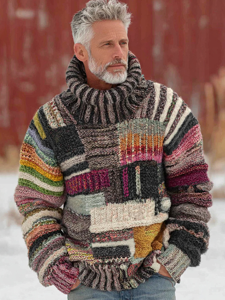 Men's Vintage Colorblock Patchwork Cozy Knit Jacquard Fairman Island Jacquard Thick Warm Turtleneck Sweater