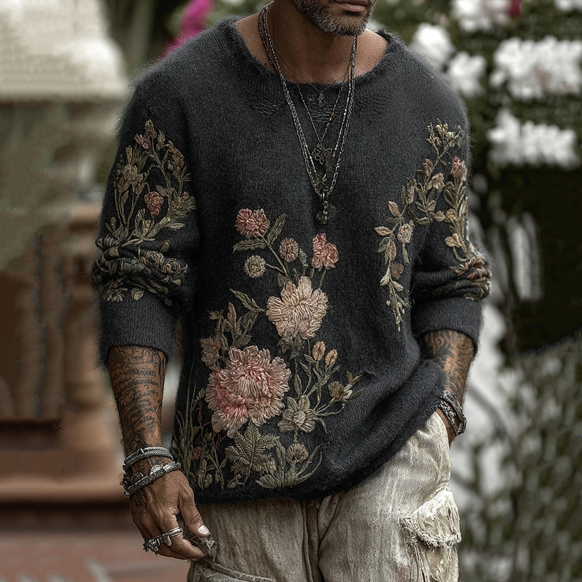 Men's Classic Floral Art Jacquard Thick Warm Round Neck Sweater