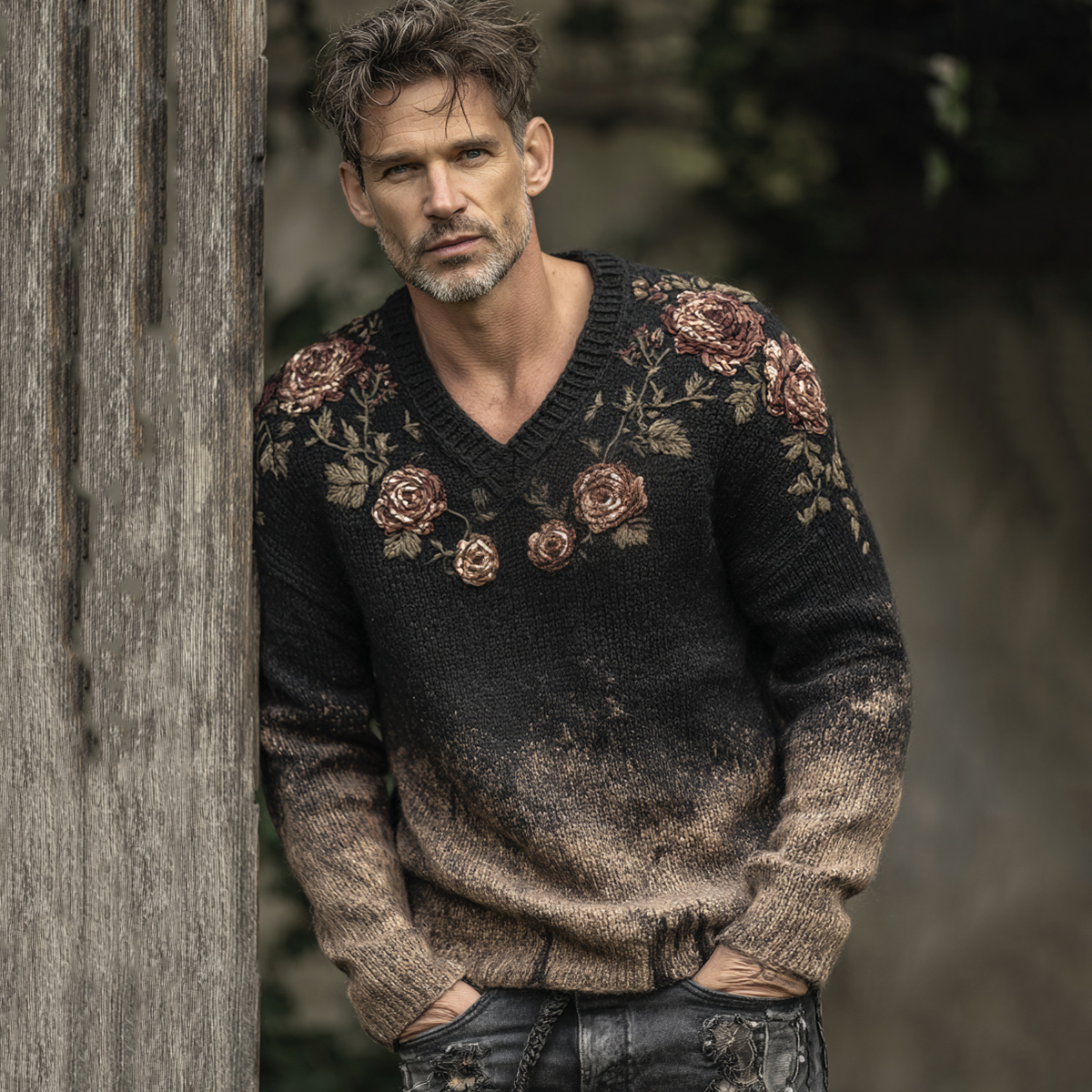 Men's Retro Floral Art Jacquard Thick Warm V Neck Sweater