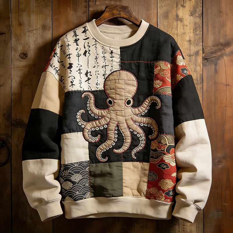 Men's Retro Octopus Japanese Art Patchwork Print Casual Sweatshirt