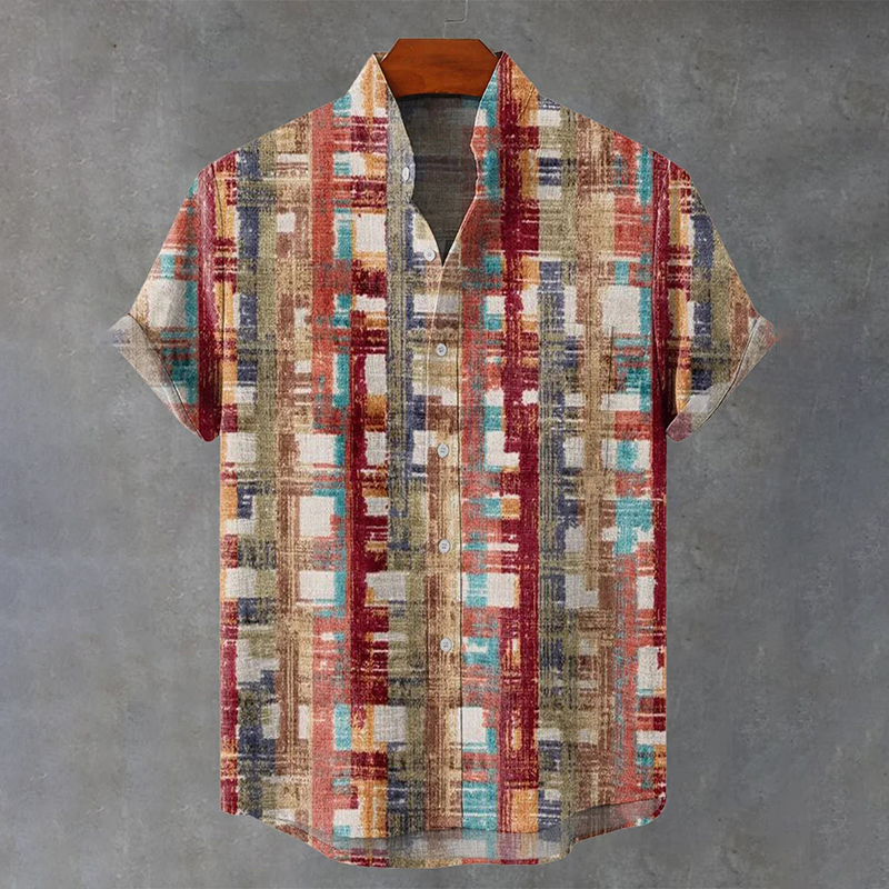 Men's Stripe Printed Art Short Sleeve Linen Blend Shirt