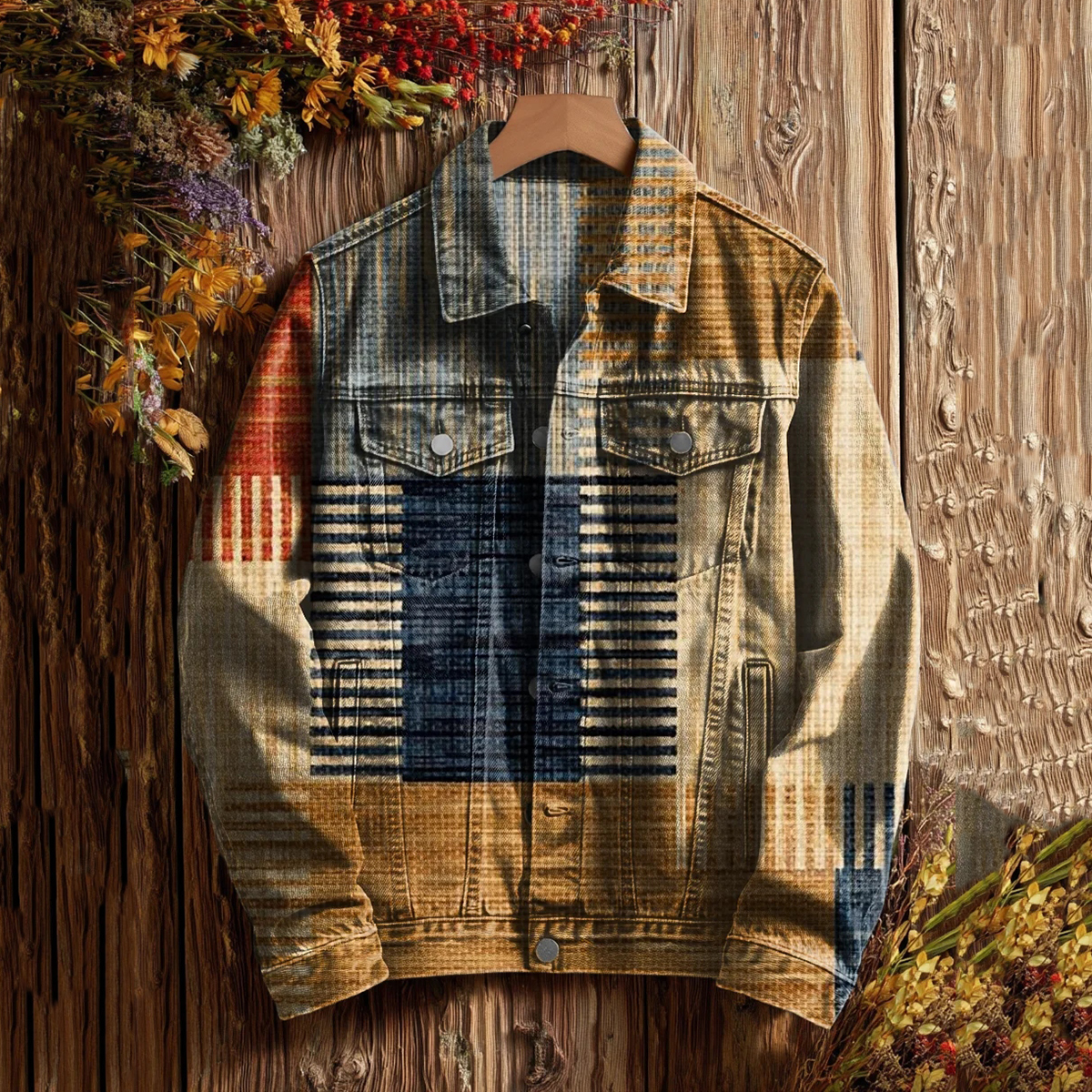 Men's Retro Western Plaid Print Casual Denim Jacket