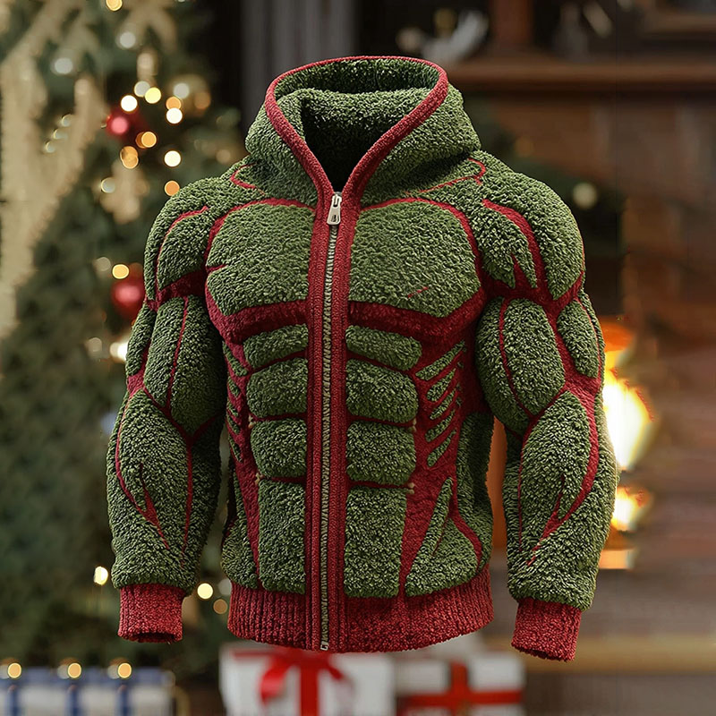 Men's Christmas Muscles Fuzzy Printed Zipped Sweatshirt