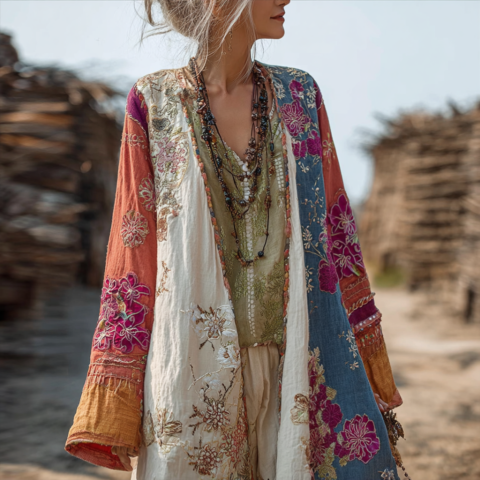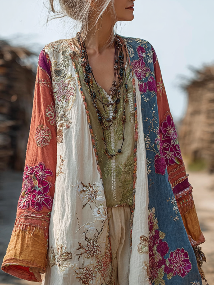 Bohemian Style Plant And Flower Embroidery Printed Women's Cotton And Linen Long Cardigan