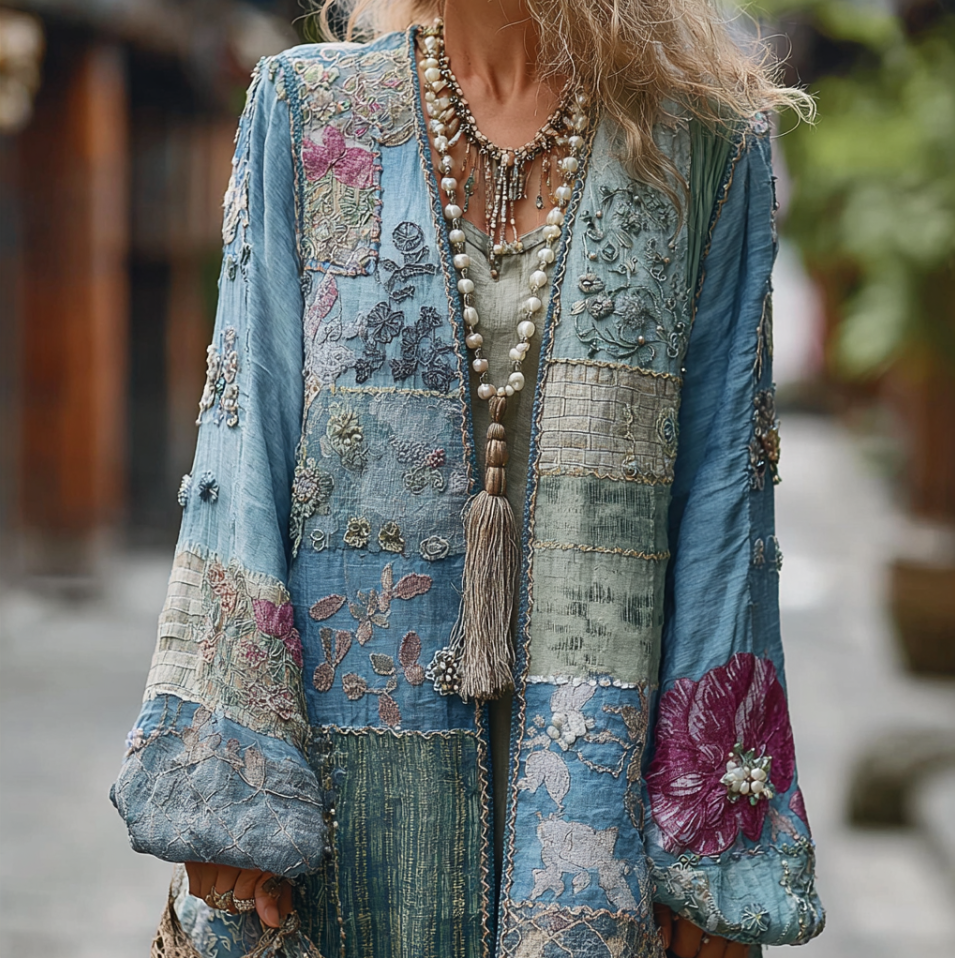 Bohemian Style Plant And Flower Embroidery Printed Women's Cotton And Linen Long Cardigan