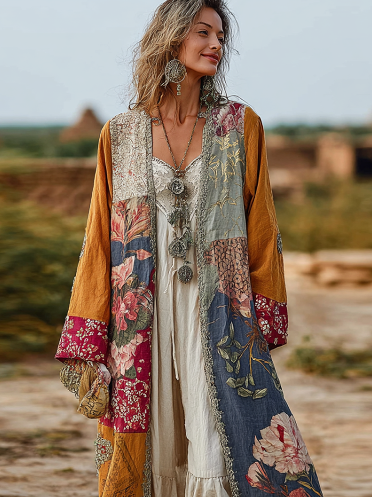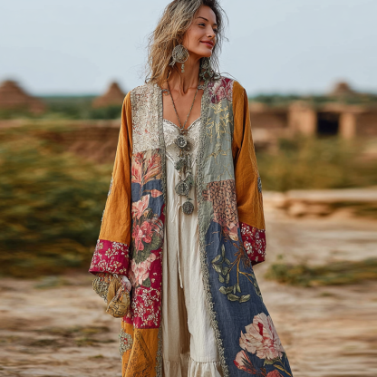 Bohemian Style Plant And Flower Embroidery Printed Women's Cotton And Linen Long Cardigan