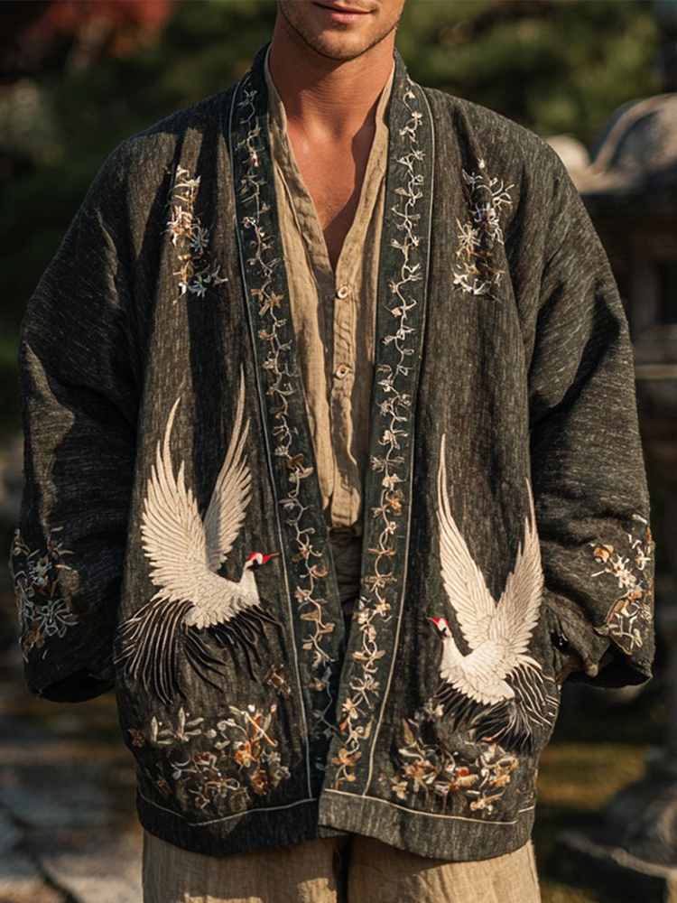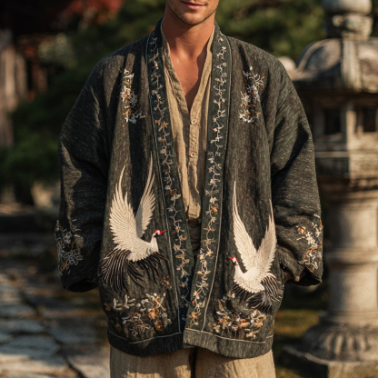 Japanese Cranes With Floral Art Linen Blend Kimono Cardigan