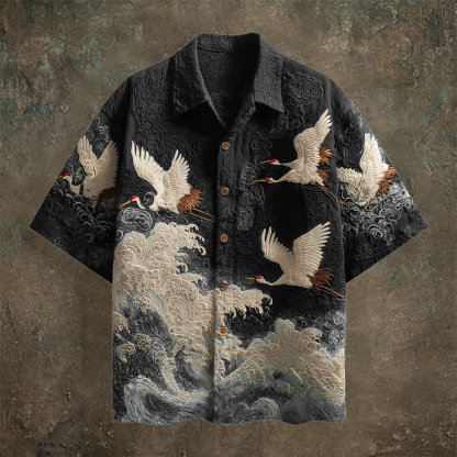 Japanese Wave & Crane Men's Casual Linen Short Sleeve Shirt