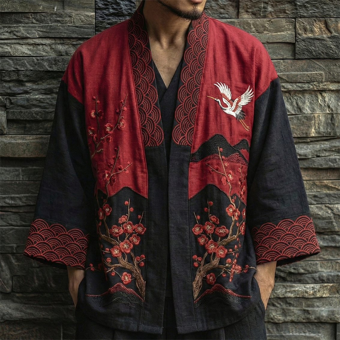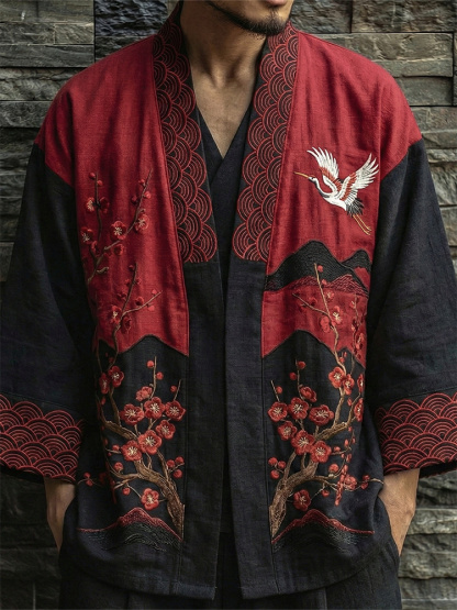 Men's Japanese Cherry Blossom And Crane Art Pattern Linen Blend Kimono Cardigan