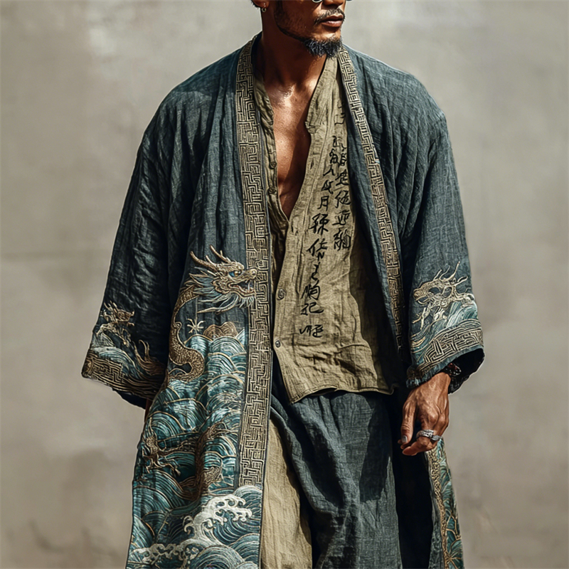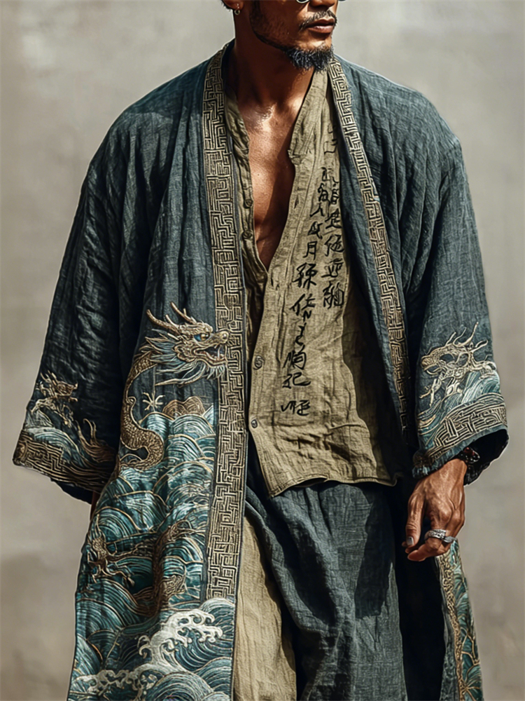 Men's Japanese Dragons Sea Waves Linen Long Kimono