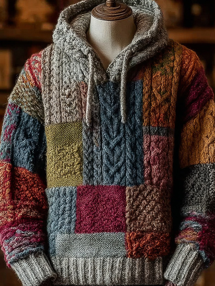 Men's Retro Geometric Patchwork Cozy Hooded Sweater